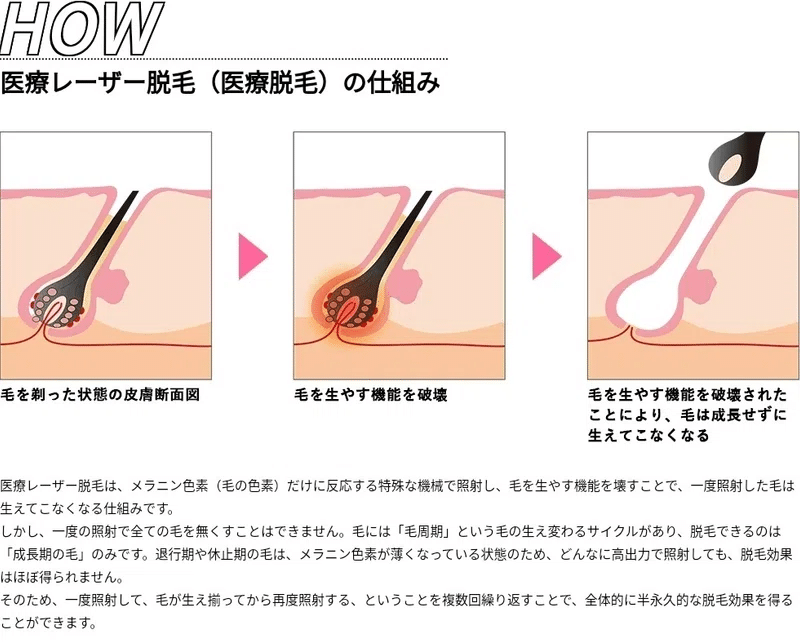 医療脱毛とは医療機関で医療従事者しか取り扱いが出来ない高出力の脱毛器を使用して行う脱毛方法です。医療脱毛は高出力で発毛細胞を破壊することによって根本的に毛をなくし再度生えてこなくさせます。